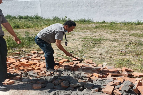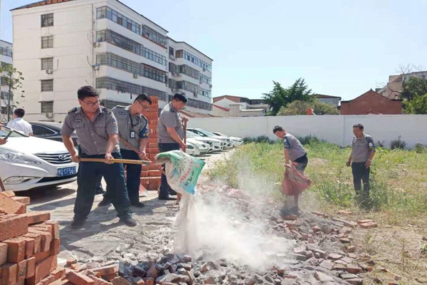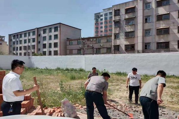 6月6日上午,烈日当空,暑气蒸腾,平舆农商行停滞数月的大院改造工程再次启动,为方便车辆进出,平舆押运大队赶在动工之前,组织队员平整地基,清理道边垃圾。